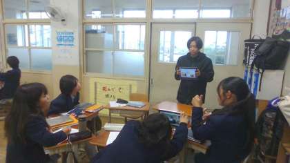 そして、各自が、身の回りにあるユニバーサルデザインの製品や設備を1つ決めて、その使い方や自分の考えを説明する英文を作成し、タブレットでスライドを示しながら発表していきました。