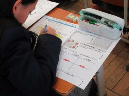 まず、日本史(社会科)の授業では、「海賊って何?」という興味深い投げ掛けから、「倭寇(わこう)」を取り上げ探究していく内容です。高校の教科書の内容と中学校の教科書の内容を比較し、新たな発見もあったようです。みんなしっかり聞いていましたね!