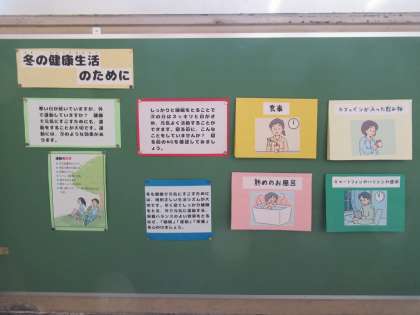 校内には、すてきな掲示物がたくさん見られます。保健室前にも見つけましたよぅ。現在、「冬の健康生活のために」というタイトルで、食事や入浴、またカフェインやコンピュータ機器について、その効果や注意点をめくり方式で掲示していただいています。