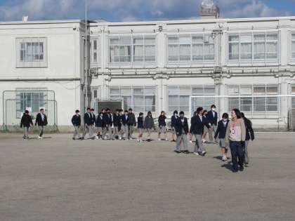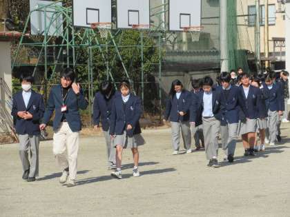 訓練「地震発生」直後の身を守る行動から、避難経路を使った移動、グラウンドでの整列・点呼まで、速やかに行動できましたね。タイム的にも、前回より早い避難となりました。