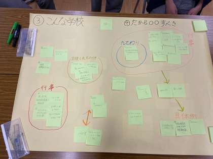 個人の時間をとったあとは、本部役員7人での共有です。模造紙に近い意見を集約していくKJ法を採用しました。様々な意見や考えを効率的に整理する目的があったからです。あっという間に50分が経過しました。改めて情報交換した模造紙を眺めてみると多角的な視点で、考えが表出されています。今回のカンファレンスの内容を、次回の教職員カンファレンスに引き継いでいきます。