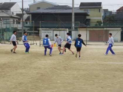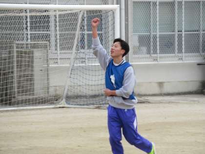 現在、3年体育の授業では、サッカー競技に取り組んでいます。本日の授業を覗かせてもらうと、ゲーム形式の学習となっていました。KUJOサッカーリーグ、略して「Kリーグ」の開始です。