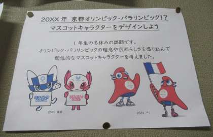 次に、1年美術で取り組んだ「20XX年 京都オリンピック・パラリンピックマスコットキャラクター」のデザインです。