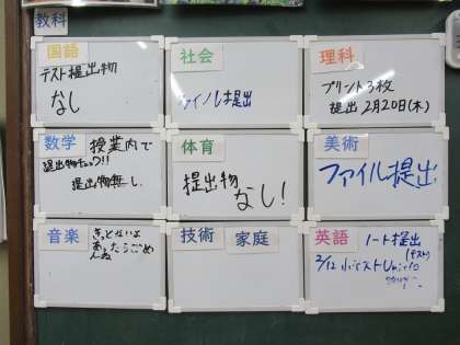 おっ!素晴らしい!! クラスの教科係さんが、ボードを使って連絡してくれています。皆さんしっかり確認して、提出してくださいね。教科係さん、ありがとう!