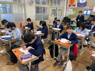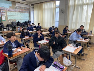 1年2組では、「傍観者でいいのか」という教材を用いて、人間の弱さを克服し、自らの意志や判断で責任ある行動をすることの大切さに気付き、いじめを抑制しようとする態度について学習しました。