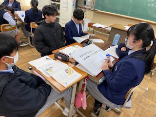 1年3組では、「本が泣いています」という教材を用いて、図書館が抱える問題について、社会の形成者であるという自覚をもち、よりよい社会の実現に向けて考えました。