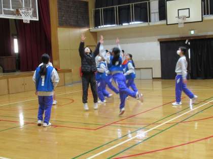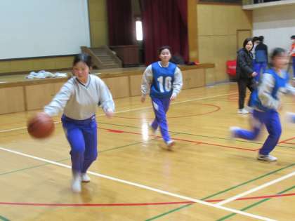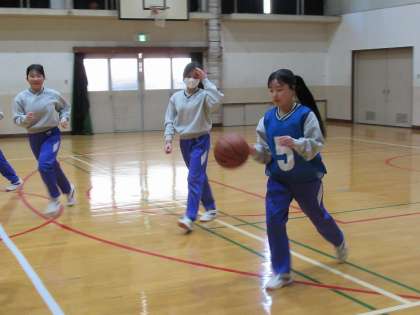 3年生の体育では、明後日の球技大会に向けて、バスケットボールの学習の仕上げに入っています。今日は、球技大会のチームによるゲーム形式の学習でした。