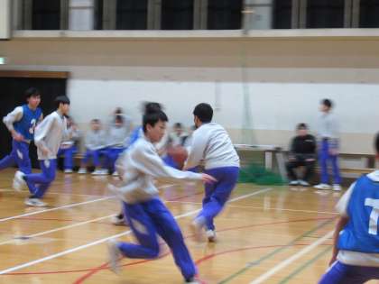 3年球技大会の方は、前半最後のゲーム、第6試合を迎えました。男子、2組Bチームと3組Bチームの戦いです。この試合も、どこからでもシュートが飛んでくるし、スピードを生かした攻守に、全員が自分の力を発揮していました。やるねぇ!