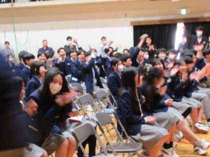 今年は入場からドラマチックな演出で、3年生ひとりひとりが、壇上に登場してきます。そして、「祝」の文字に飾られた後輩お手製のコサージュを取ってハイポーズ!一気に会場が盛り上がります。