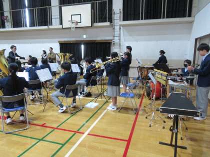 「九条中へ、ようこそ!」の掛け声とともに、吹奏楽部の演奏で新入生を迎えました。