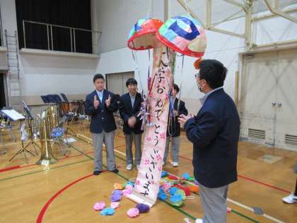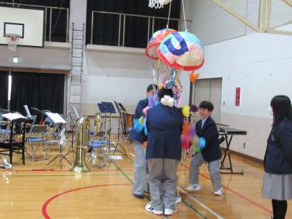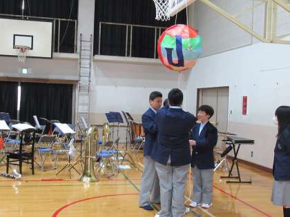 「体育館後方をご覧ください。これからくす玉割りをしてもらいます。」