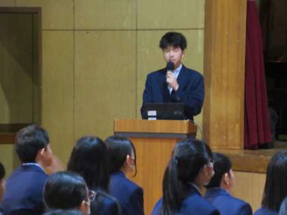 次に、教養委員会について、教養委員長Kさんから説明がありました。大きな仕事は、「お昼の放送・図書室の開室・学校行事での役割」です。