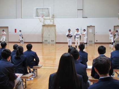 野球部は、気合い十分に、普段の練習の様子を再現してくれました。