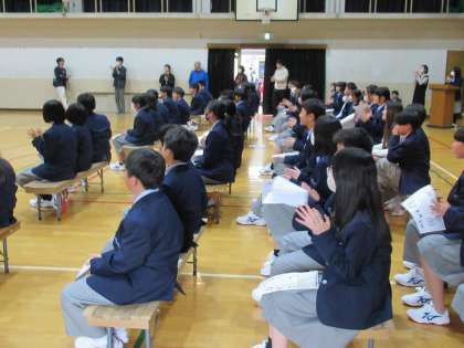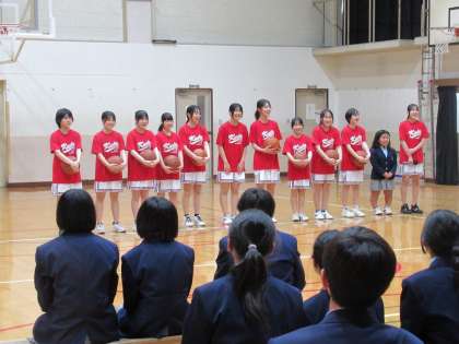 女子バスケットボール部は、ゴール下での切れの良いプレーを披露しながら、代表の部員から明るく呼びかけてくれました。