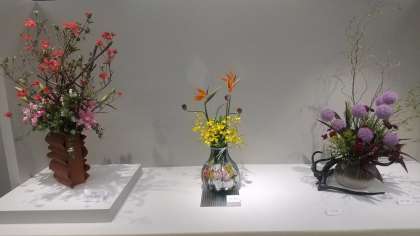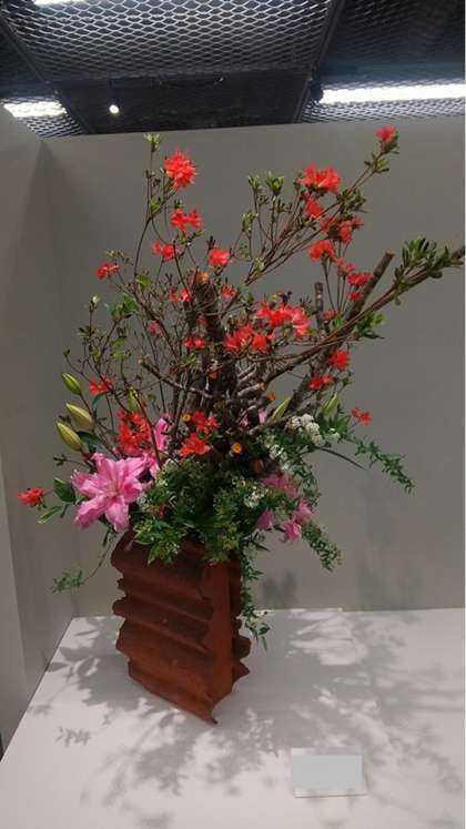 そこには、咲き誇るユリとツツジに、小手毬(コデマリ)の可愛さを生かした見事な生け花が展示されていました。迫力の中にも、どこか優しさや可愛らしさを感じる作品に、心温まる思いでした。