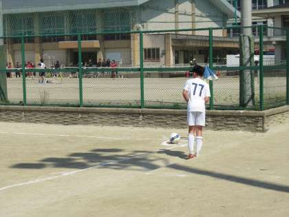 サッカー部は、S中学を相手に、初戦に挑んでいました。取材班が到着した時は、試合後半5分が経過したあたりで、Kさんのコーナーキックからの攻撃の場面でした。
