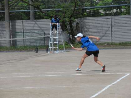 第1ゲームの流れそのままに、第2ゲームも先行していきたいところでしたが、相手もさすがです。九条中のいいサーブや決め球を返し、ポイントを重ねていきます。第2ゲームは、逆に、2−4で取られ、ゲームカウントをイーブンとされます。