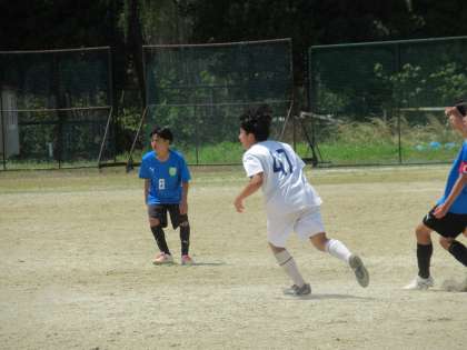なんとか突破口を開こうと、九条中は、前線の選手に、たてのボールを送ります。しかしこれを高い最終ラインでカットし、すぐさま攻撃に移していくR中学の展開に苦戦が続きます。頑張れー!