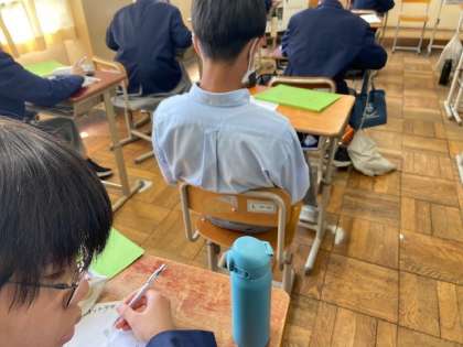 地域や学校に関わるすべてのつながりを深める、それぞれの特色を伝える、といった観点から今年度は九条中学校のマスコットを製作することになりました。今年は本当に、様々な新しい取り組みがどんどん始まっていきますね。九条中学校への愛着が高まること間違いなしです。そんなマスコットを考えてくれている場面です。マスコットの案は本日が締め切り日ですよ。