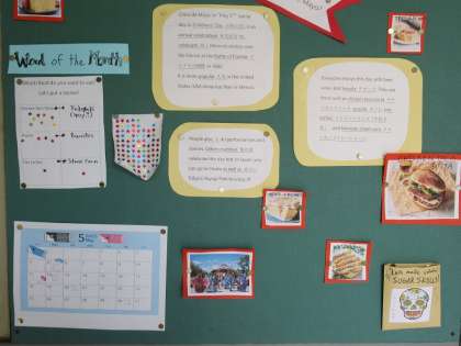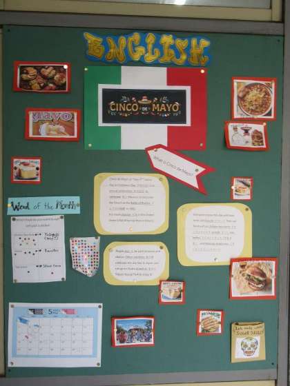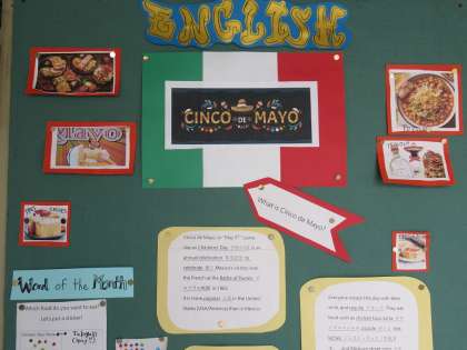 「Cinco de Mayo」といって、スペイン語で「5月5日」という意味で、メキシコの祝日を表しています。そのことについての説明を、メキシコの文化も含めて紹介していただいています。カラフルな掲示で、とってもステキ! ALTのJ先生、ありがとうございます。
