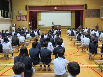 新たな一歩を踏み出す、今年の九条中学校について、生徒会本部を代表してKさん、先生の方からも、文化祭担当のS先生、体育祭担当のN先生から、それぞれ説明していただきました。
