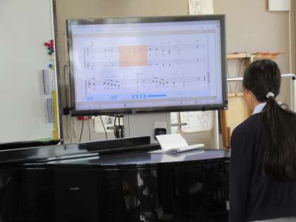 音楽ソフトのリード機能を使い、大型テレビに映し出される楽譜と歌詞を目で追いながら、丁寧な発声で歌い上げていきます。しばし鑑賞させていただきました。よい学習です。