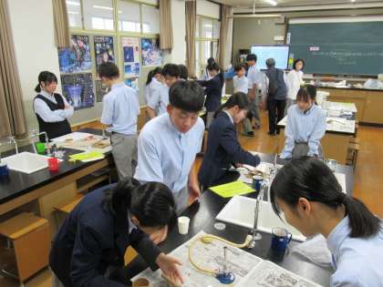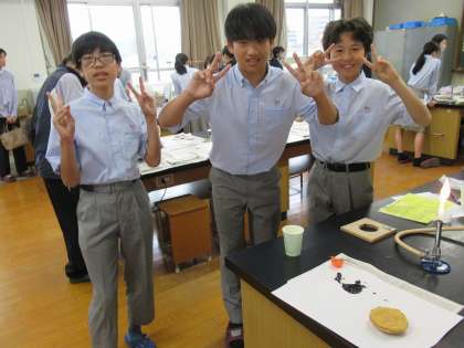 実際に実験をする中で、気体の発生に気付いていきます。二酸化炭素ガスに気付いたでしょうか?カルメ焼きの良いにおいが、生徒の皆さんの思考を活性化させてくれます。