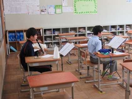 取材班が覗かせていただいたときは、パートごとに各教室で個人練習をしているところでした。1年生部員の皆さんも様になっています。素晴らしい!これからも素敵な演奏を期待しています。