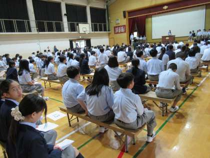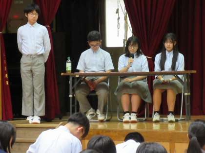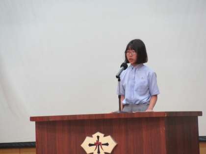 生徒総会も終盤に差し掛かり、生徒会本部よりMさんが、アルミ缶・エコキャップ運動についてと本年度の生徒会費予算について説明してくれました。
