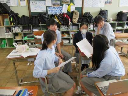授業内容は、高校訪問発表会に向けての学習です。来月行われる「ポスターセッション」に向けて、スライドを使った発表練習に取り組んでいました。