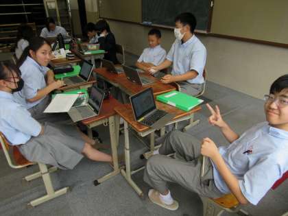 グループごとに、アイデアや工夫を出し合い進めていきます。ローテーションやPC画面での共有、セリフを回しながらの確認と、発表が出来上がっていく様子がわかります。頑張っている!