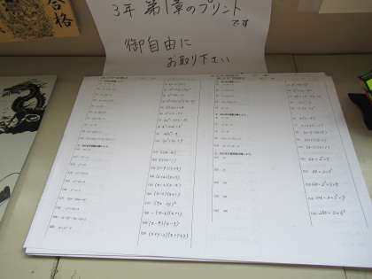 校舎内には、ちょっとしたスペースに、教科の先生から勉強に役立ててもらおうと学習プリントが置かれています。