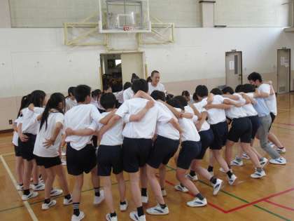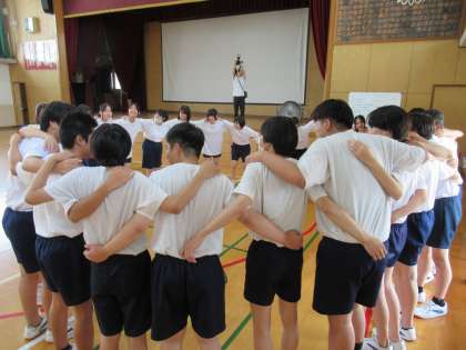 出ました!九条中伝統の円陣です。クラスごとにかけ声も考えながら気持ちをひとつにしていきます。