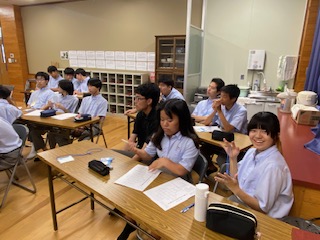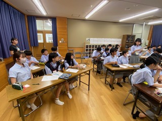 こちらは青の様子です。ふれあいサロンで取り組みました。今回は色主任の先生方に、道徳の授業をしていただきました。なかなかこういった機会ってないので、新鮮でした。終末では、全体で3つ大切にしたいことを決め、そのカードをもとにスローガンを決めました。決めたスローガンを、合唱曲練習に活かし、色での士気を高めていってくださいね。