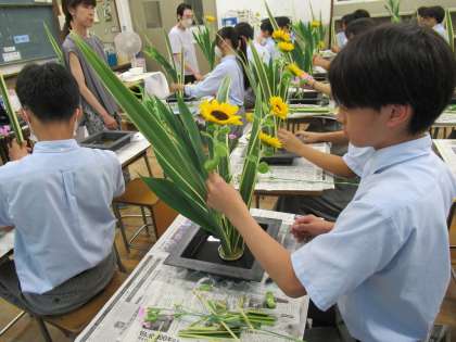 今回、いけるお花は、入才蘭(にゅうさいらん)、ひまわり、ナデシコ、檜扇(ひおうぎ)です。京都では、祇園祭に「檜扇」をいける伝統があることなどもご紹介いただき、関心が高まります。