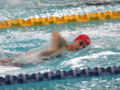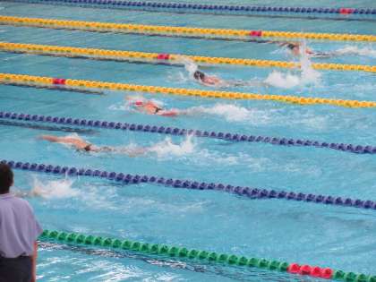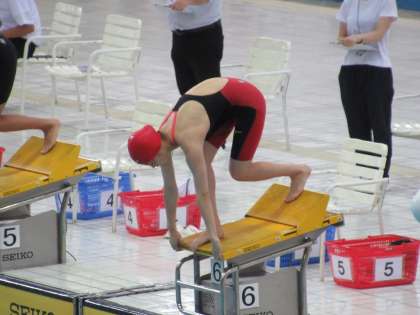 200m自由形最終組に、2年N・Sさんが登場してきました。6レーンを泳ぐNさんは、レース前半から上位グループにつけ、激しい先頭競いを演じます。