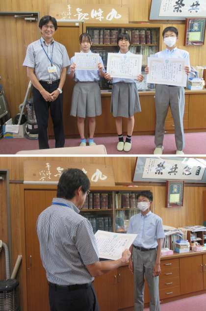 毎年恒例の『社会を明るくする運動』の標語(今年のテーマ:感謝)に応募した、南区の多くの中学生の中から、見事 1-2 K.Sさんと2-1 I.Mさんが『入選』に、2-1 N.Sさんが『佳作』に選ばれました。