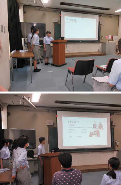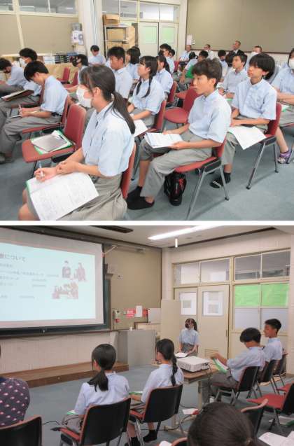 7/10(木) 第2学年は高校訪問の発表会を行いました。発表資料がとても工夫されており、見やすかったです。また、4分程度の発表時間内に収まるように話すはやさを練習して本番に臨みました。私は、4分の発表時間だと余るかなと思っていましたが、逆に足りないくらいでした。全部で17の学校について発表がありました。自分の発表した高校の他に、たくさんの高校の特色を知ることができたようです。みなさんの感想を読むと、私たち教員が思っている以上に、たくさんのことを学び、楽しんでくれたことが分かります。ここまで2か月間以上の取組になりました。よく頑張りましたね。高校訪問発表会は大成功でした!