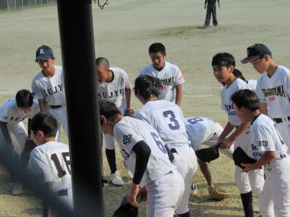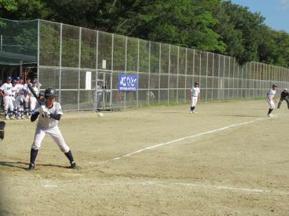 1点を追いかける5回表の九条合同の攻撃は、先頭バッターがライト前クリーンヒットで出塁すると、続くバッターが確実に送りバントでランナーを進めます。