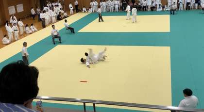 本日(7/19)に、京都市武道センターで柔道の選手権大会が行われました。2年生のIさん・Uさん・Kさん・Yさん・Yさんの5人が出場しました。現場リポーターが駆けつけると、熱気あふれた会場となっていました。