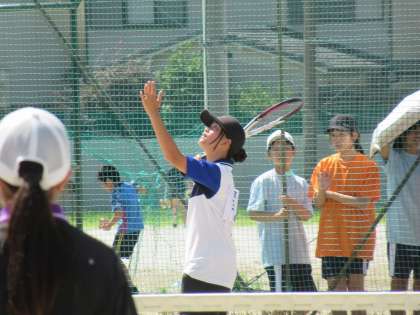 ポイント2−2、3−2、3−3と互角です。このデュースから先にアドバンテージを取ったのはM中学です。ここはなんとしても取り戻したいところでしたが、渾身のサーブが惜しくもフォルトとなりゲームセット。最後まで粘りましたが、惜しくも敗退となり、九条1勝1敗です。