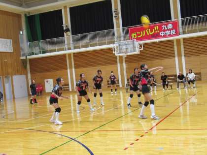 第2セット、先行していきたい九条中でしたが、立ち上がりサーブカットに苦しみます。相手チームの強いサーブやコースをつくサーブにレシーブが上がりません。よく見ると手元で変化しているようです。それでも、懸命にフォローするメンバーです。落ち着いて!