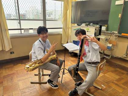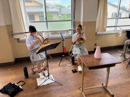 8月2日(土)、京都府吹奏楽コンクール中学生の部小編成が行われ、九条中吹奏楽部も出場しました。今年は例年と比べて、ホールを借りての練習や他校の演奏を聴く機会が多く、気合い十分でした。前日には、2年生からお守りをもらい、晩御飯に刺激物を食べないように心がけ、迎えたコンクール当日。朝からチューニングや合奏など、最後の準備をしました。