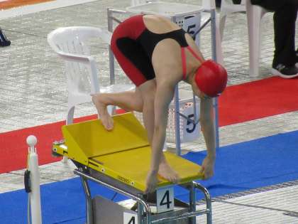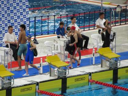 女子200m自由形予選1組に、2年N・Sさんが登場してきました。いつものようにレース前のルーティンをこなし、選手紹介のアナウンスにも丁寧な挨拶で応え、堂々たるものです。