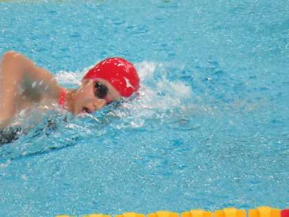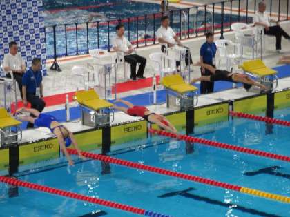 電子音の合図に、鋭くスタートを決めたNさんは、最初の50mをやや抑え気味に泳ぎます。
