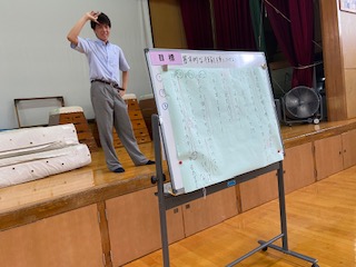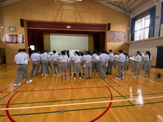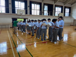 まず体育館で全体練習をしていたのは青団です。色主任のS先生から全体へと指示が出ています。指揮者のKさんも指示を出してくれていましたね。先日の取り組みで作成した模造紙での歌詞カードも活躍です。まだ歌詞を覚えきれていない人もいたようで、声が小さいようにも感じてしまいます。これが体育館練習です。本番は人も多く入るホールなので、まだまだギアを上げていかないといけないですね。