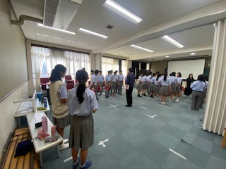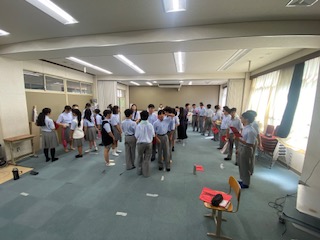 続いて赤団です。多目的室1から音楽室という割り当てでした。多目的室1では、合唱隊形の確認です。ソプラノ・アルト・テノールと、指示を聞いて的確に動いていました。音楽室でも全体練習です。指揮者の横で最初から聞こうとしたところ、1番の出だしのボリュームに驚きを隠せませんでした。2年生のUさんに「先生、驚いてたやんな?」と言われ、良い雰囲気で練習できているねと返しました。2年生のAさんも「めっちゃ良い感じやと思う」とのことでしたよ。
