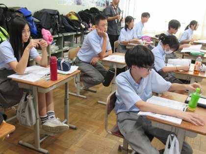 それぞれ希望の進路は違っても、直接的に、間接的に役に立つ内容です。おっ、2組の皆さん、食い入るように資料を見ながらN先生の話に耳を傾けています。