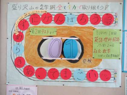 下の写真は、2年の掲示物で、陸上のトラックをイメージし第2回テストまでの道のりを表していただいています。そのカウントダウンも「1」に!