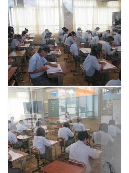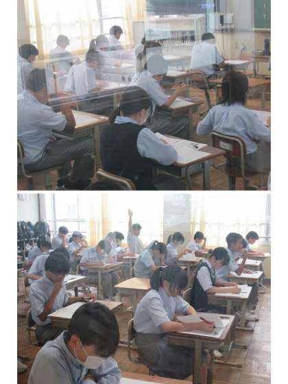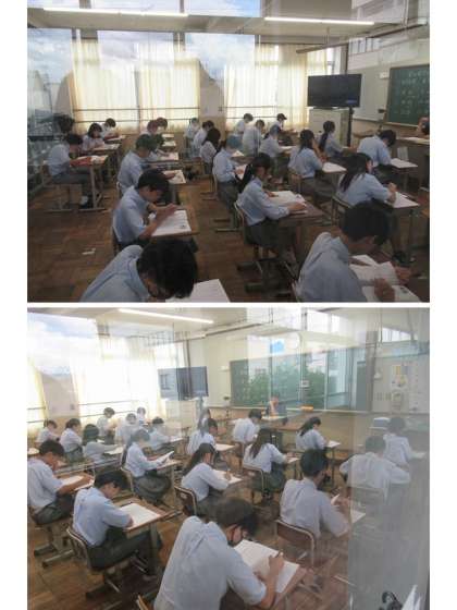 こちらは、2年1組・2組・3組の様子です。昨年の経験を生かし、落ち着いて受験できています。陸上のトラックをイメージした掲示物の効果も出ているのではないでしょうか!